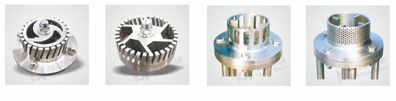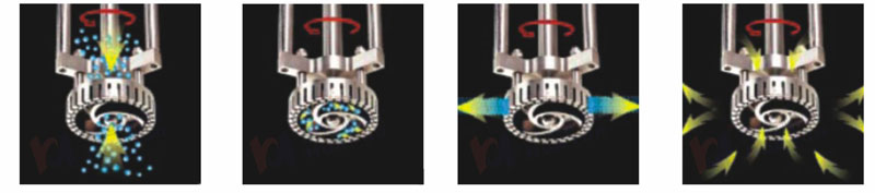 3、在調整旋轉的轉子外端產生至少15m/s以上的線速度,高度可至40m/s,并形成強烈的機械及液力剪切、液層摩擦、撞擊撕裂,使物料充分的分散、乳化、均質、破碎、同時通過定子槽射出。