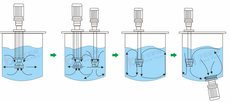 4、物料不斷高速地從徑向射出,在物料本身和容器壁的阻力下改變流向,與此同時在轉子區產生的上、下軸向抽吸力的作用下,又形成上、下兩股強烈的翻動喘流。物料經過數次循環,最終完成分散、乳化、均質過程。